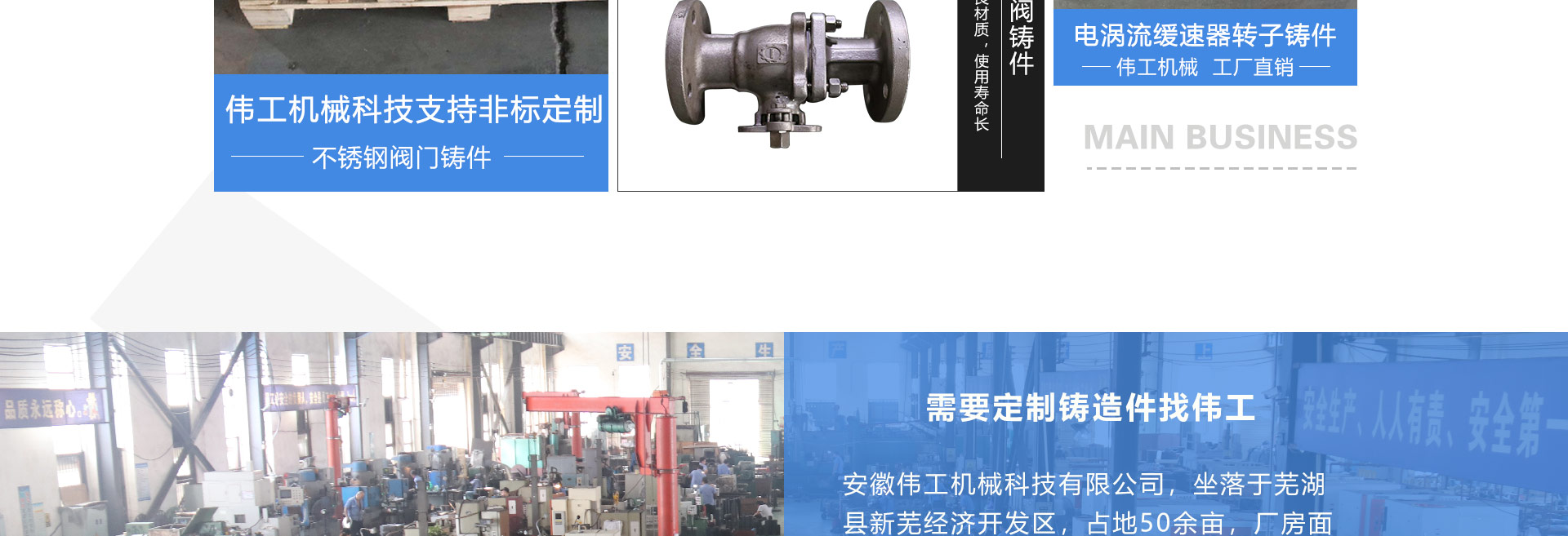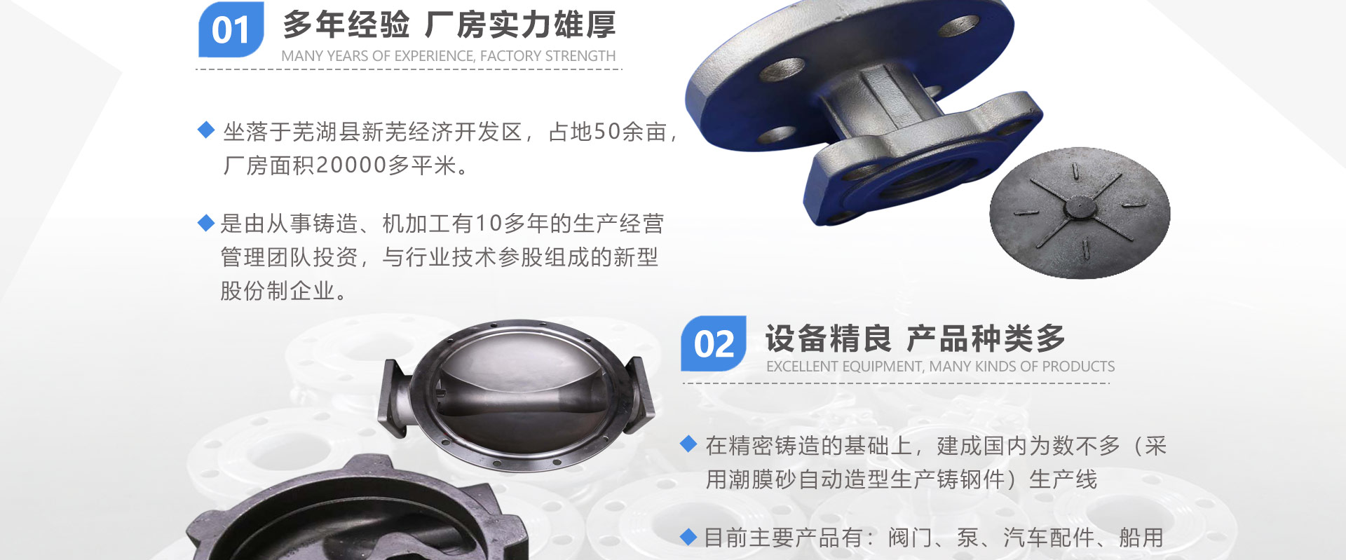 安徽偉工機(jī)械科技有限公司,坐落于安徽蕪湖新蕪經(jīng)濟(jì)開(kāi)發(fā)區(qū),是一家専業(yè)從事鑄造產(chǎn)品設(shè)計(jì)、研發(fā)、生產(chǎn)、銷售于一體的企業(yè),公司為客戶的產(chǎn)品提供多樣的技術(shù)支持與設(shè)計(jì),公司主要鑄造技術(shù)有潮模砂鑄造、硅溶膠精鑄工藝。主要產(chǎn)品有:不銹鋼閥門配件、泵閥配件、汽車配件、工業(yè)管道配件、工程機(jī)械配件、汽車配件等。材質(zhì)為:低合金鋼、304、316、316L、鉻鉬鋼、哈氏合金、碳鋼、雙相鋼等。公司已先后通過(guò)ISO9001和TS16949等多種體系審核,以完備的管理手段和齊全的檢測(cè)設(shè)備滿足客戶需求,進(jìn)的設(shè)備,専業(yè)的技術(shù),嚴(yán)謹(jǐn)?shù)墓芾?,穩(wěn)定的質(zhì)量。服務(wù)客戶,鑄造未來(lái),偉工誠(chéng)摯的歡迎新老客戶共同商洽合作